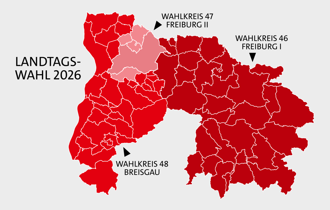 Wahlkreis 46 Freiburg 1 - kurz WK46 - ist übrigens der einzige Wahlkreis in ganz Baden-Württemberg, der sich über drei Landkreise streckt, nämlich Breisgau-Hochschwarzwald, Freiburg und Waldshut. Außerdem haben wir auch den höchsten Punkt im Ländle - nämlich den Feldberg.